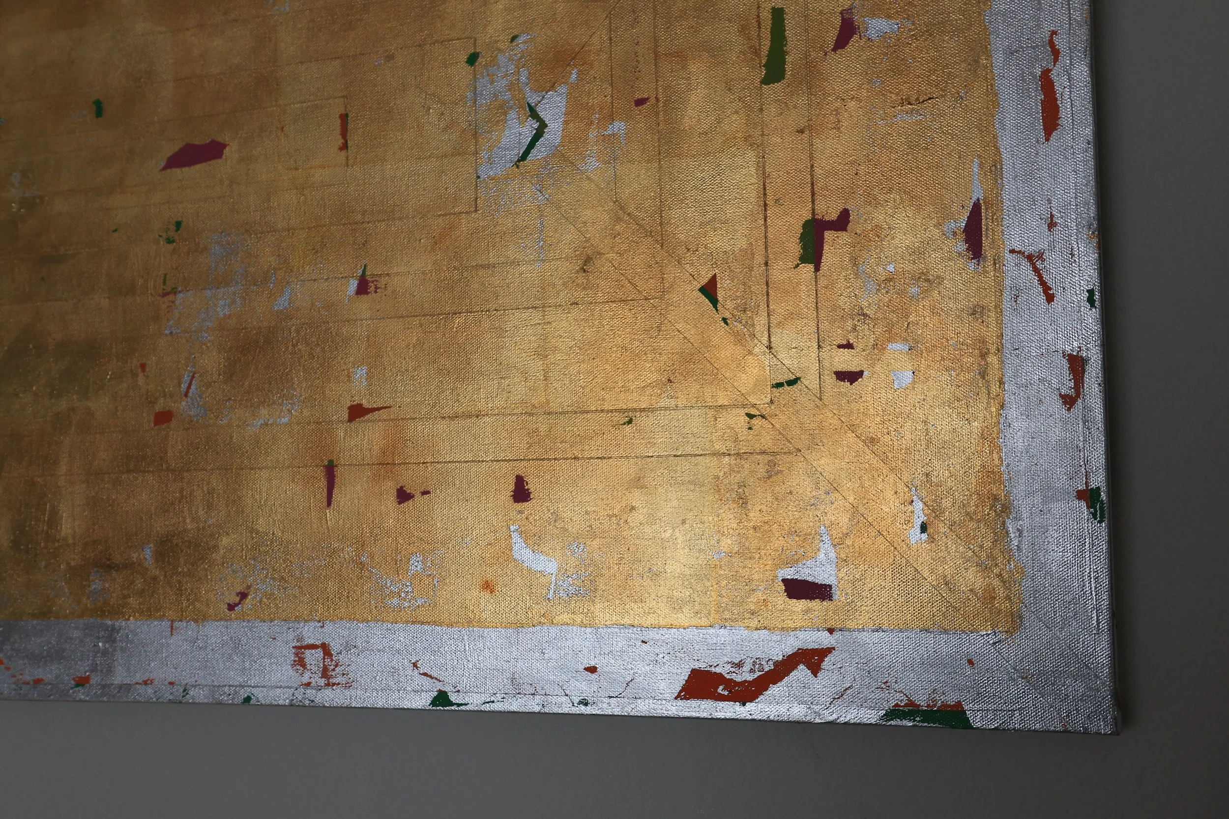 Acrylic underpainting, gold leaf, silver leaf